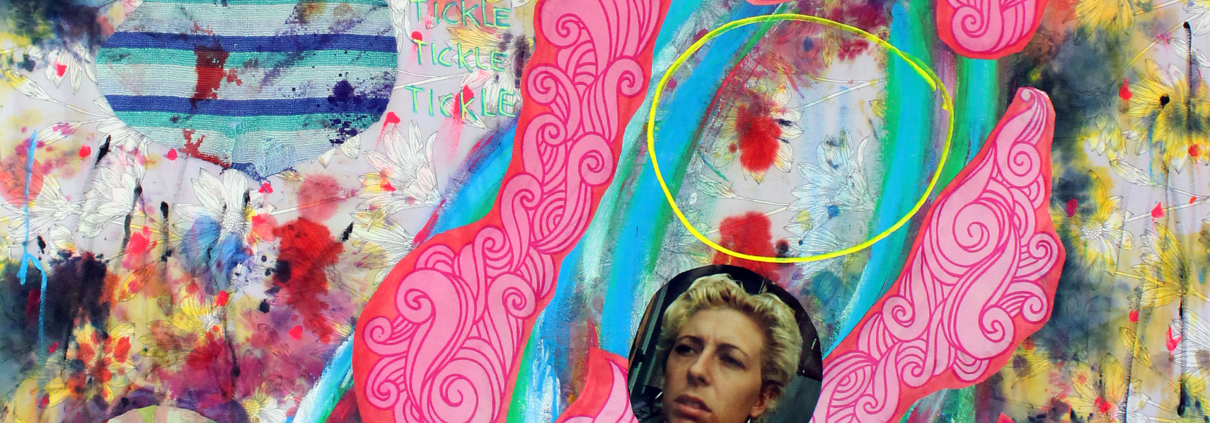 Upstairs gallery is bright in color but eerie with the faces staring at the viewer. There is a combination of analog photos and collages on large scale hand dyed household fabrics. Here one can face their fears in brightness. In the gallery downstairs, the works are darker and spatially intrusive. The dark humor steers us through the dark thoughts. If you need, I will be your friend and guide you through.