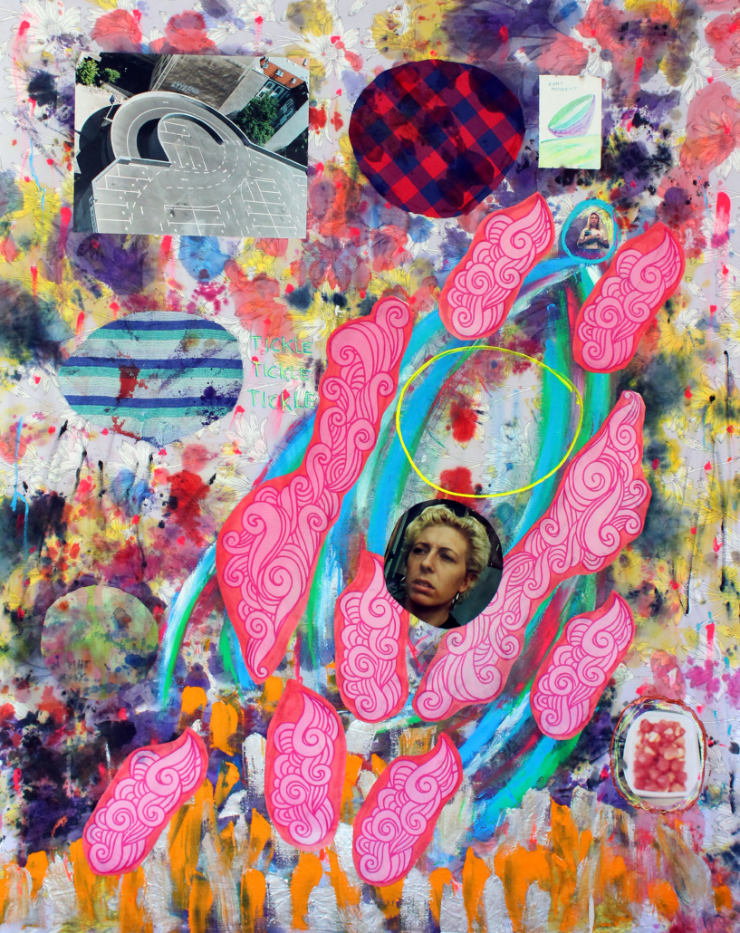 Upstairs gallery is bright in color but eerie with the faces staring at the viewer. There is a combination of analog photos and collages on large scale hand dyed household fabrics. Here one can face their fears in brightness. In the gallery downstairs, the works are darker and spatially intrusive. The dark humor steers us through the dark thoughts. If you need, I will be your friend and guide you through.